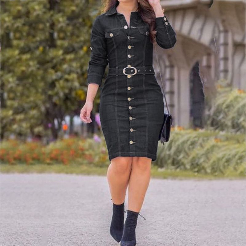 Women Vintage Long Sleeve Button Up Knee Length Skinny Denim Dress Vintage Bodycon Midi Jeans Dresses Belt Vestidos Fall Winter From Holywe 36 03 Dhgate Com